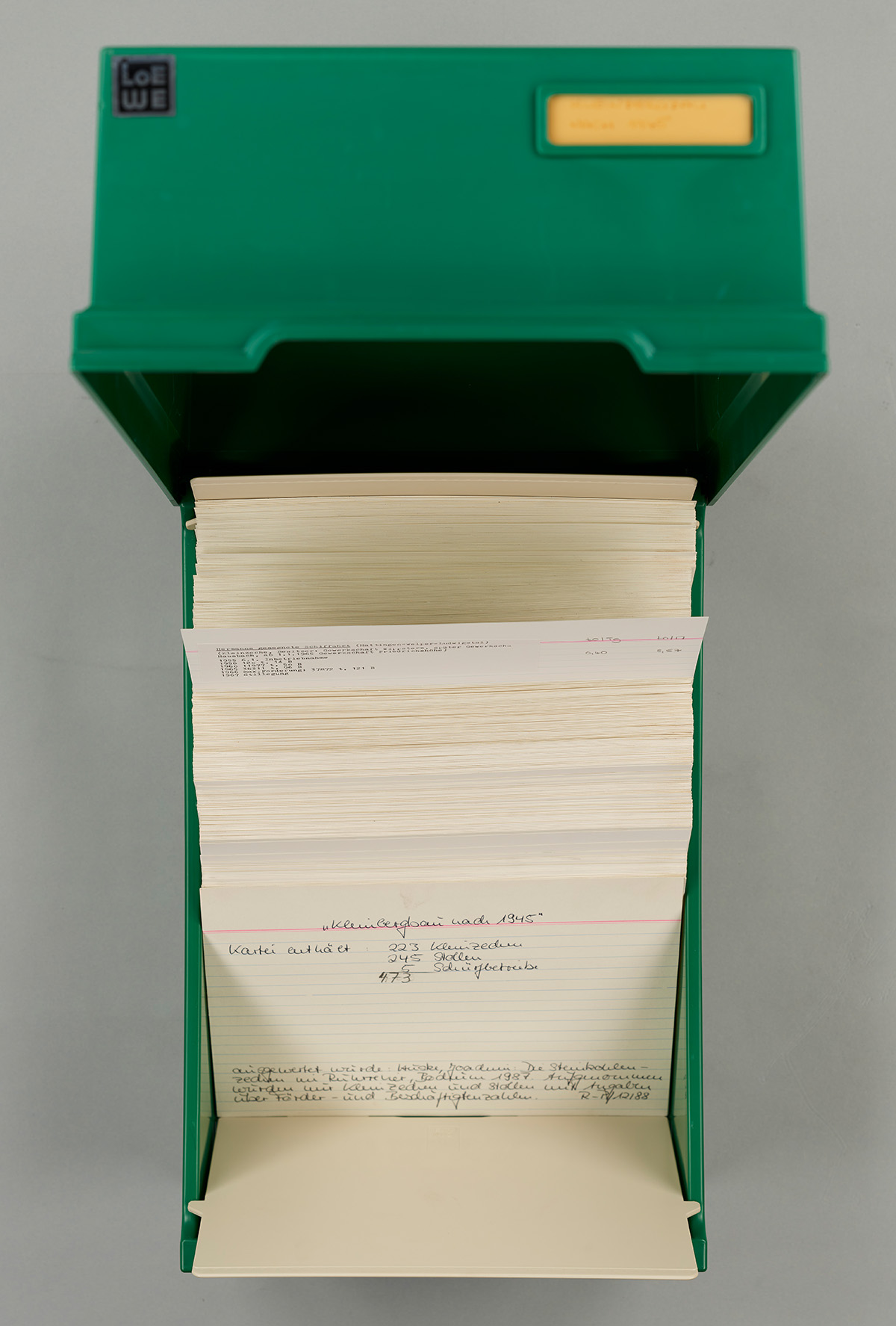 Eine amtliche Definition des Kleinbergbaus bzw. einer Kleinzeche gibt es nicht. Als Maß wurde von Friedrich Hollmann eine Jahresfördermenge unter 100.000 t genannt. Evelyn Kroker ging in ihrer Untersuchung zur Wirtschaftlichkeit der Kleinzeche von einer Zahl von unter 100 t Tagesförderung – bei 303 Arbeitstagen also weniger als 30.300 t im Jahr – und einer Belegschaft von unter 100 Beschäftigten aus. Dabei kam sie auf eine Zahl von 455 Kleinbetrieben in den Jahren von 1949 bis 1960, wobei 202 davon nur bis zu 10 t pro Tag förderten, und damit als so genannte Kleinstzechen gelten. Was uns zur ersten „Spur“ des Kleinbergbaus im montan.dok führt: einem grünen Kasten mit säuberlich beschriebenen bzw. beklebten Karteikarten, die in Krokers Artikel auch Erwähnung finden und sich im montan.dok/Bergbau-Archiv in der Zwischenregistratur erhalten haben. Diese Forschungsdaten basieren auf Joachim Huskes Zusammenstellung der Steinkohlenbergwerke im Ruhrgebiet, den Jahrbüchern des Deutschen Bergbaus und weiteren Aktenstudien.