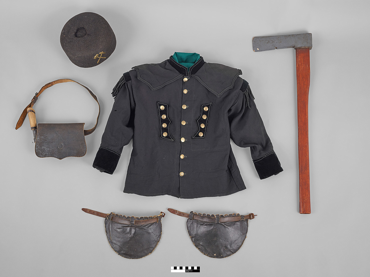 Die Kinder-Paradeuniform besteht aus einer Uniformjacke und einer Filzkappe sowie als Zubehör einer Tscherpertasche, einem Zimmerlingsbeil sowie einem Paar Kniebügel. Eine früher möglicherweise ebenfalls vorhandene Hose ist nicht überliefert (montan.dok 030002852000). Die Uniformjacke ist aus ungefüttertem schwarzem Leinenstoff genäht und mit einem breiten Umlegekragen sowie an verschiedenen Stellen mit Samtaufschlägen und mit Messingknöpfen versehen. Ihrem Charakter als Kinderuniform entsprechen die mitüberlieferten spielzeughaften Attribute: Das Beil ist aus bemaltem Holz gefertigt und die Kniebügel sind aus schwarzem, mit Pappe hinterlegtem Leinen gefertigt. Hinzu kommt die Tscherpertasche aus Leder mit einer seitlich angebrachten Messer-Attrappe mit Holzgriff ohne Klinge. Uniformjacke samt Zubehör gelangten Anfang der 1990er-Jahre aus Privatbesitz in die Musealen Sammlungen und sind nicht datiert. Doch gibt ein Herstellervermerk auf der Tasche einen Hinweis auf die in Dresden ansässige „Actien-Gesellschaft für Leder-Maschinenriemen- und Militäreffecten-Fabrikation vormals Hch. Thiele“, die von 1889 bis 1900 allgemeine Lederwaren in ihrem Programm anbot.