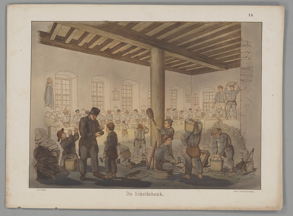 Sieht man einmal von der Kindergröße der Uniformjacke ab, so unterscheidet sie sich kaum von denjenigen, die seit dem 17. Jahrhundert, in verschiedenen Ausführungen auf Bergparaden getragen, Teil ständischer Repräsentation waren. Dass Kinder überhaupt an solchen Umzügen teilnahmen, ist zwar nicht belegt, dennoch gehörte Kinderarbeit bereits in vorindustrieller Zeit zu einer von Erwachsenen geprägten Arbeitswelt. Im Bergbau wie auch in der Landwirtschaft und im Handwerk trugen sie ganz selbstverständlich zum Familieneinkommen bei. Die Anfang des 19. Jahrhunderts im Montanwesen einsetzende bzw. sich beschleunigende Industrialisierung änderte daran kaum etwas. Im Gegenteil. Trotz zunehmender Mechanisierung im Bergbau stieg der Bedarf nach Kindern als ungelernten und billigen Arbeitskräften, deren Tätigkeit sich kaum von der in vorindustrieller Zeit unterschied. Arbeiteten im Harzer Erzbergbau im 18. Jahrhundert Kinder ab 10 Jahren in Pochwerken zum Zerkleinern von Erzen, so war dies ein Jahrhundert später immer noch der Fall. Eduard Heuchlers Lithographie „Die Scheidebank“ von 1857 zeigt Kinder und Jugendliche, die aufgeschüttetes Erz in Körben transportieren und es an einem langen Tisch sitzend mit einem Pochhammer zerkleinern (montan.dok 030000861024).