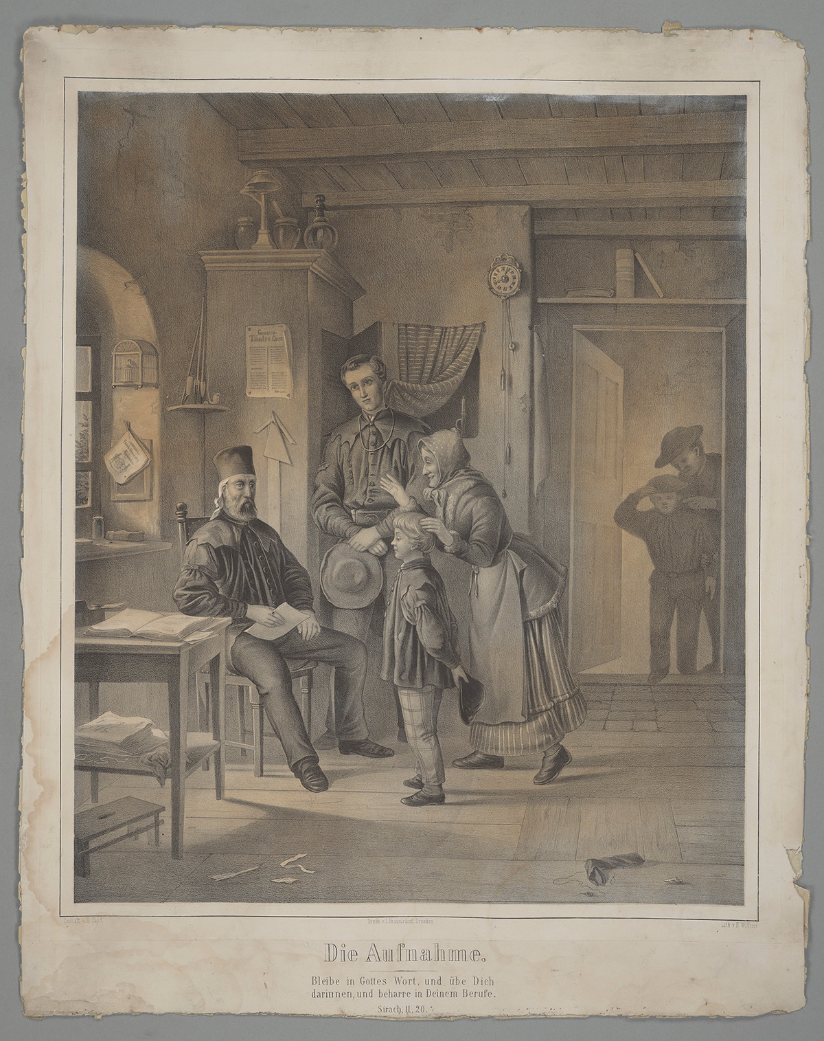 Die Lithografie „Die Aufnahme“ (montan.dok 030003301001) von Hans Anton Williard (1832-1867) nach Motiven des Malers Karl Ernst Papf (1833-1910) aus der zweiten Hälfte des 19. Jahrhunderts lässt sich wie eine Illustration dieses Übergangs betrachten. Zu sehen ist in einer Schreibstube ein Junge, den seine Mutter einem älteren Bergmann zur Anstellung im Bergwerk empfiehlt. Ein weiterer jüngerer Bergmann schaut dem Gespräch zu, während im Hintergrund ein anderer Junge mit einem Erwachsenen in der Tür wartet. Wie die beiden erwachsenen Bergleute auf dem Bild, trägt auch der Junge einen einfachen Bergkittel, der ihn im Moment der Anstellung als angehenden Bergmann ausweist. Das Bild erzählt demnach von dieser Aufnahme in den Beruf und zugleich von der jeder lohnabhängigen Tätigkeit zugrunde liegenden Hierarchie. Während der ältere Bergmann als einziger sitzend in seinem Stuhl und mit Bergkittel und Schachthut als Autoritätsperson klar erkennbar ist, zeigt sich das Kind sprachlos und unmündig. Das unter das Bild gesetzte Bibelzitat legt aus christlicher Perspektive die Erwartungen an das künftige Arbeitsleben des Jungen fest: „Bleibe in Gottes Wort, und übe Dich darinnen, und beharre in Deinem Berufe.“