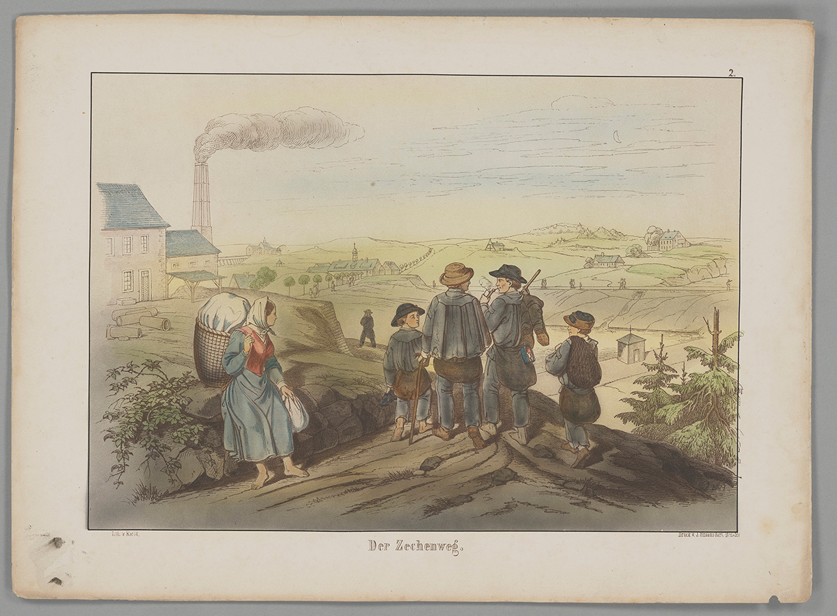 Wie sehr Textilien in diesem Sinne Zugehörigkeiten markieren, verdeutlicht eine andere Lithografie Heuchlers, „Der Zechenweg“ (montan.dok 030000861002) von 1857, die inhaltlich als eine Fortsetzung der „Aufnahme“ betrachtet werden kann. Das zuvor in den Bergmannsberuf aufgenommene Kind findet sich nun innerhalb einer Gruppe von vier Bergleuten auf dem Weg zur Arbeit. Alle tragen als einheitliche Arbeitskleidung einen Bergkittel und das Fahrleder, darüber hinaus individuelle Arbeitsausrüstung wie Stiefel, Blendlaterne und einen Stock. Dass zwei in der Gruppe Kinder sind, ist nur an der Körpergröße erkennbar. Das Kind als Arbeitskraft hat sich über seine Kleidung vollständig in die Arbeitswelt der Erwachsenen eingepasst. Aus dieser Perspektive unterscheiden sich Fest- und Alltagskleidung als textile Objekte kaum voneinander.